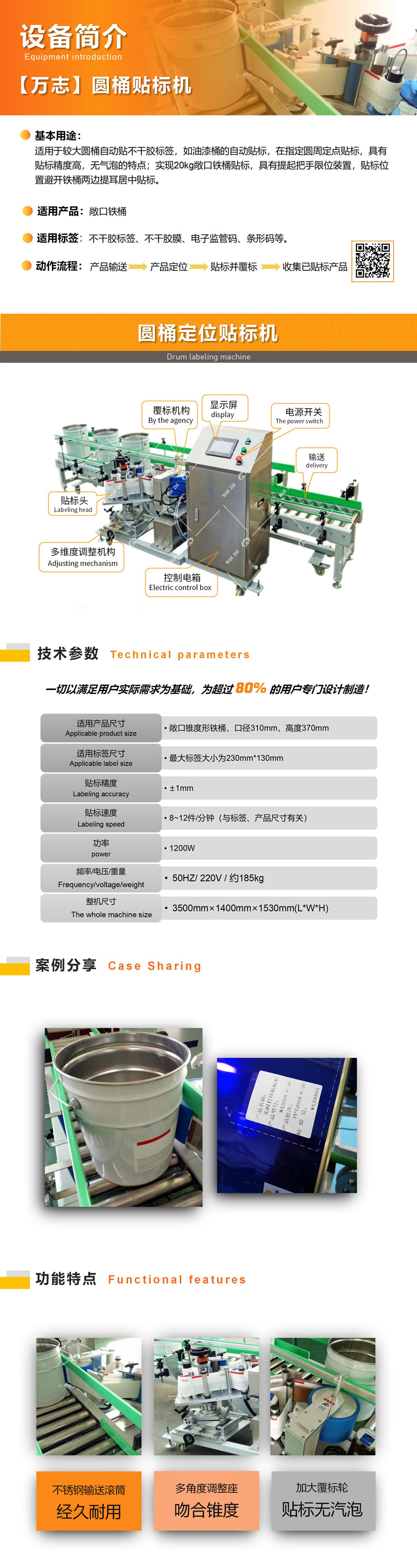 全自動(dòng)油漆桶貼標(biāo)機(jī)適用于油漆桶的自動(dòng)貼標(biāo),圓周定點(diǎn)貼標(biāo),具有貼標(biāo)精度高,無氣泡的特點(diǎn);實(shí)現(xiàn)20kg敞口鐵桶貼標(biāo),可實(shí)現(xiàn)定位貼標(biāo),具有提起把手限位裝置,貼標(biāo)位置避開鐵桶兩邊提耳居中貼標(biāo)。