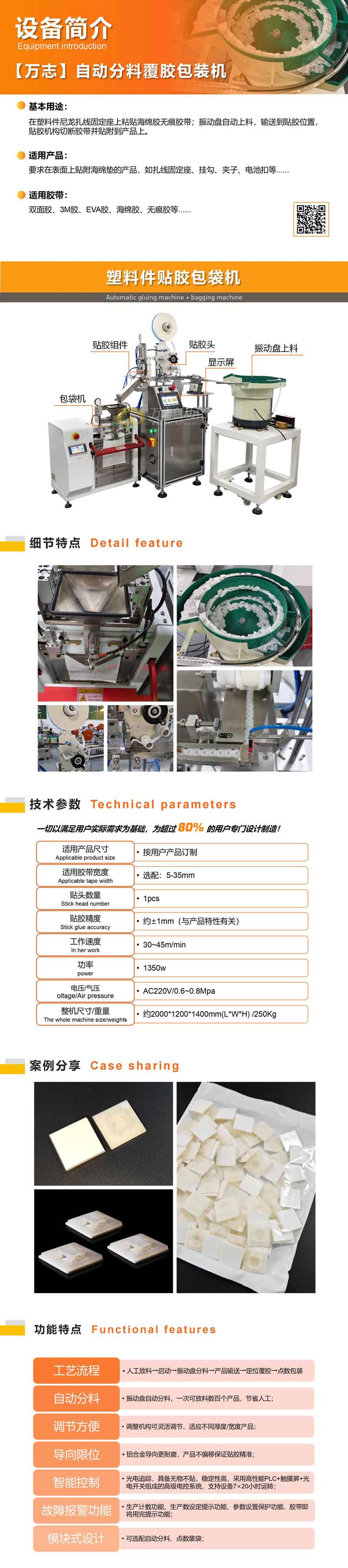 在塑料件尼龍扎線固定座上粘貼海綿膠無痕膠帶;振動盤自動上料,輸送到貼膠位置,貼膠機(jī)構(gòu)切斷膠帶并定位覆膠,點(diǎn)數(shù)包裝一體化作業(yè),大量節(jié)省人工。