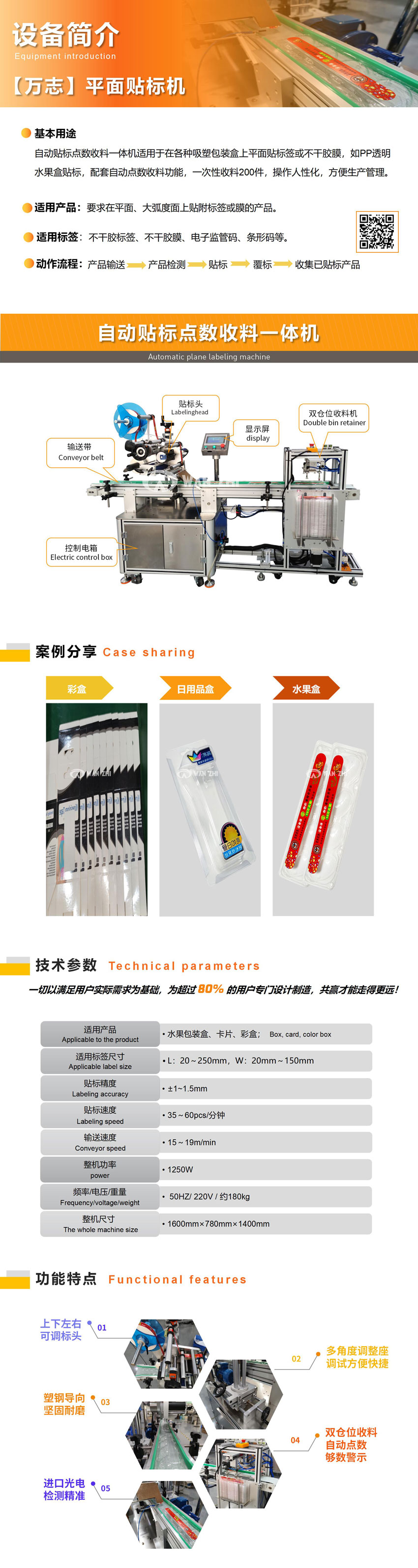 適用于在各種吸塑包裝盒上平面貼標(biāo)簽或不干膠膜,如PP透明水果盒貼標(biāo),配套自動點數(shù)收料功能,一次性收料200件,操作人性化,方便生產(chǎn)管理。
