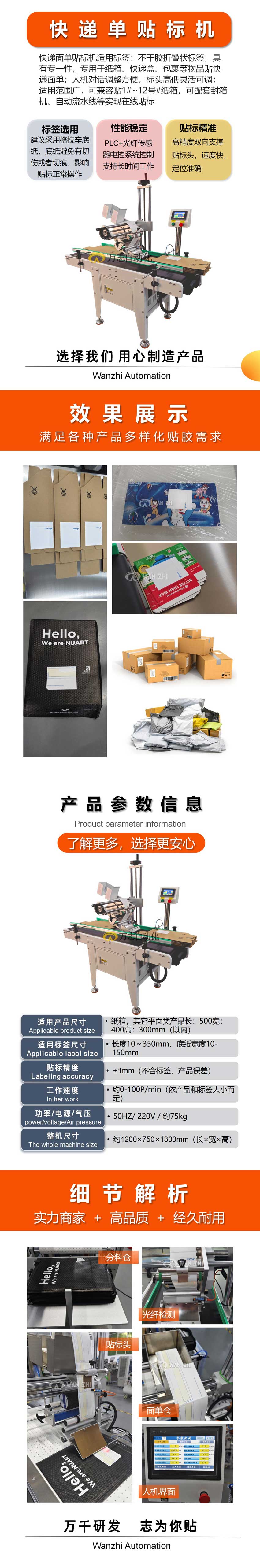貼單機專用于紙箱、快遞盒、包裹等物品貼快遞面單;人機對話調(diào)整方便,標(biāo)頭高低靈活可調(diào);適用范圍廣,可兼容貼1#~12號#紙箱,可配套封箱機、自動流水線等實現(xiàn)在線貼標(biāo)。