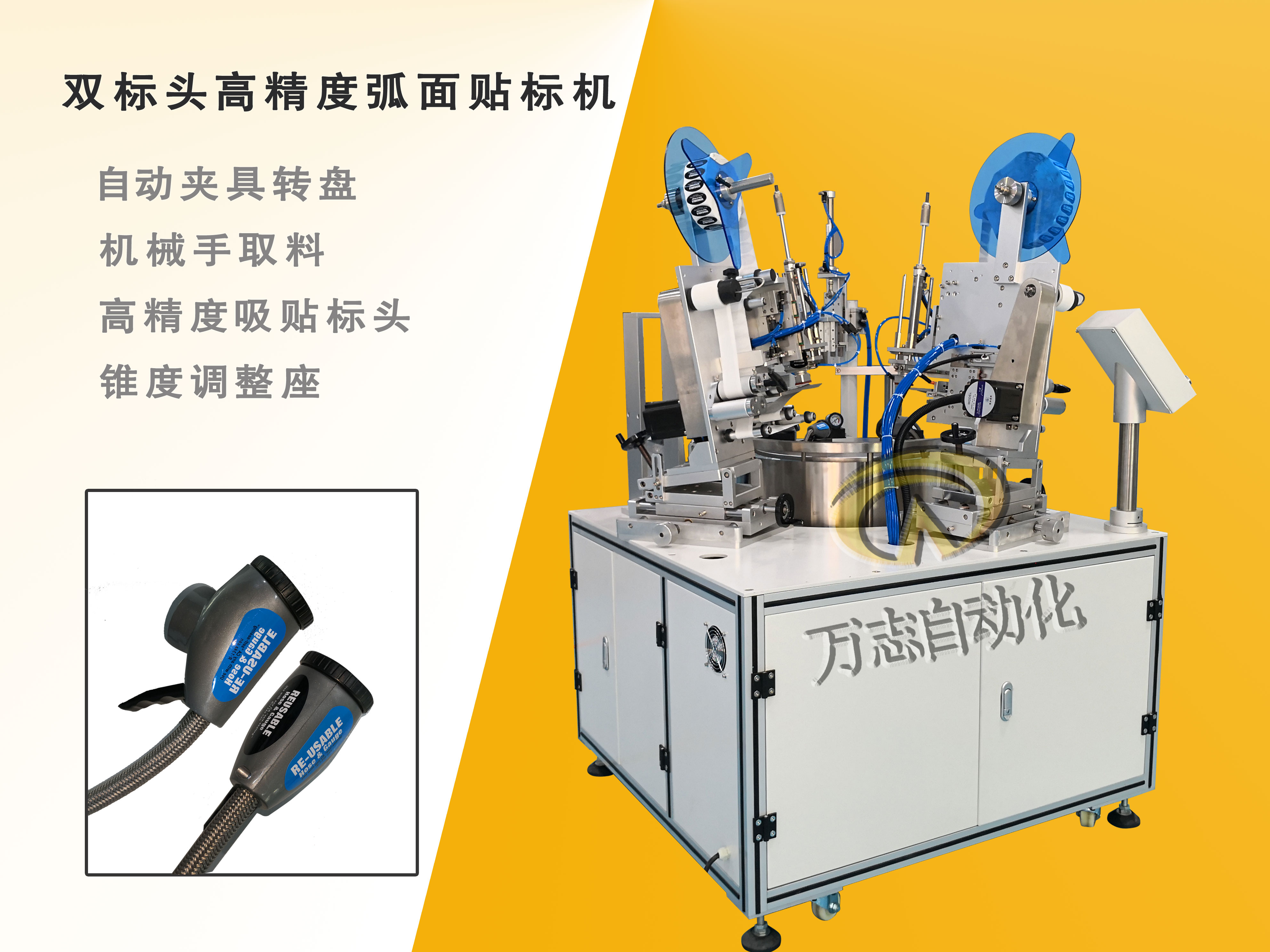 萬志貼標(biāo)機廠家生產(chǎn)的該款設(shè)備主要針對非平面異型產(chǎn)品設(shè)計,專用于氣閥弧面上貼標(biāo);