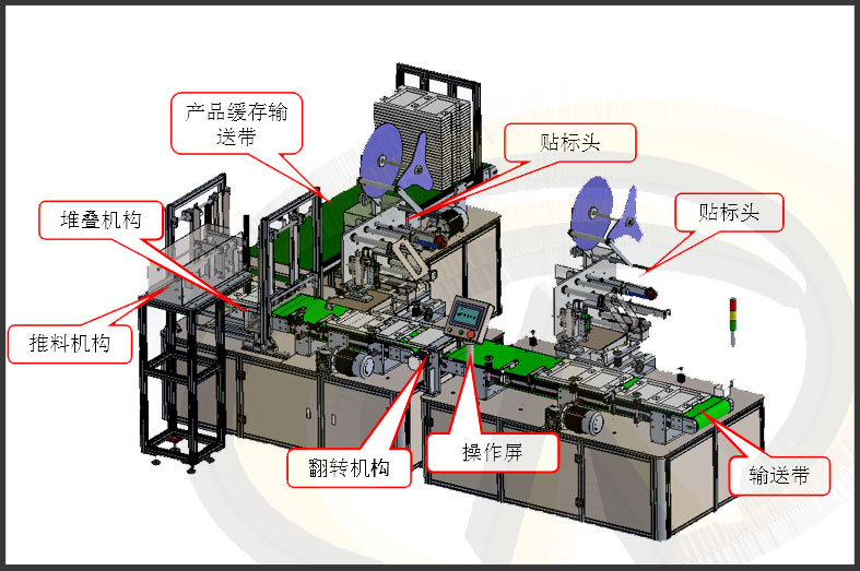 自動(dòng)啟動(dòng)——>人工放料 ——>1#標(biāo)頭攔停產(chǎn)品貼標(biāo)——>180度自動(dòng)翻轉(zhuǎn)產(chǎn)品——>2#標(biāo)頭攔停產(chǎn)品貼標(biāo)——>產(chǎn)品堆疊——>推送推疊產(chǎn)品——>人工收料。