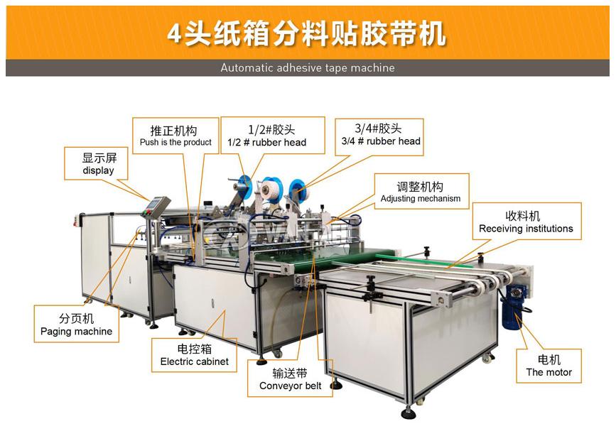 可配置2-4個(gè)貼膠頭,實(shí)現(xiàn)輸送方向同時(shí)貼2條膠帶,貼合長(zhǎng)度可任意設(shè)定;貼膠頭可根據(jù)用戶需求選配;設(shè)備可選自動(dòng)分料/收料機(jī)構(gòu),工作效率約50-90m/min(效率與產(chǎn)品尺寸有關(guān));